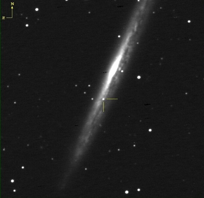 場所は、りゅう座の銀河(NGC5907)で、明るさは16.6等と肉眼で見ることはできませんが、太陽の10倍程度以上の恒星が、寿命を終えて爆発した現象とみられていて、地球からの距離は約4700万光年と推測されています。