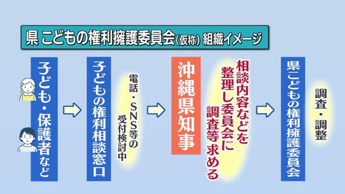 「こども権利擁護委員会」は行政からの独立が理想とされますが、県が公表した組織イメージでは、県の付属機関として、相談窓口で受けた子どもの相談内容を県知事が整理し、知事の求めに応じて委員会が調査などを行う流れになっています。