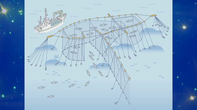 定置網漁は、海の中に巨大な網を仕掛け、魚が集まったタイミングで一気に引き上げる漁法で、今回の網は水深40メートルに設置されている。冬から春にかけて産卵のために浅瀬に上がってくる深海魚が獲れることもあるという。