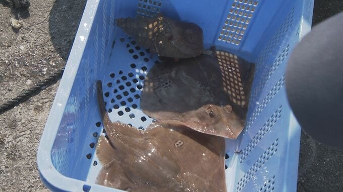 今回のカゴの中には、エイの仲間のコモンカスベ、ヤドカリ、さらにはそのヤドカリに共生するヤドカリイソギンチャク、そしてアカヒトデなどが入っていた。ヤドカリとヤドカリイソギンチャクは「相利共生」の関係にあり、互いに助け合って生きているという。
