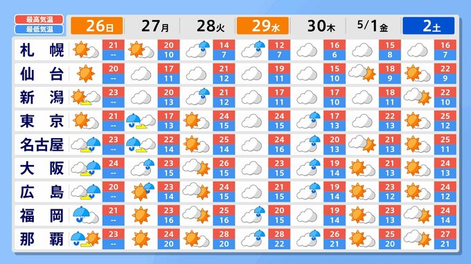 30日~5月1日も低気圧が通過する見込みで、西日本や東日本で雨が降る可能性ががあります。