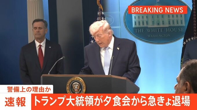 その最中、銃声とみられる複数回の大きな音が響き、トランプ大統領らが警護担当者らとともに会場から急きょ退避しました。トランプ大統領は無事で、けがは無いということです。