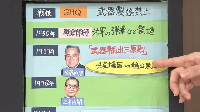終戦直後は日本を占領していたGHQによって武器の製造が禁止されましたが、1950年に朝鮮戦争が始まるとアメリカ軍の弾薬などを作り始めました。しかし、ベトナム戦争の反戦ムードが高まった1967年、佐藤内閣は「武器輸出三原則」を定め、旧ソ連など共産主義国への輸出を禁止しました。