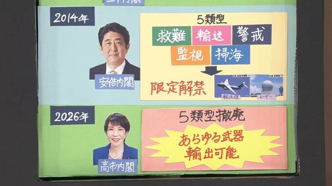 さらに1976年の三木内閣は、すべての国への武器輸出を禁止しました。大きく変わったのが2014年の第2次安倍内閣です。「救難」「輸送」「警戒」「監視」「掃海」の戦闘に関わらない5つの類型に限って輸出を解禁したのです。