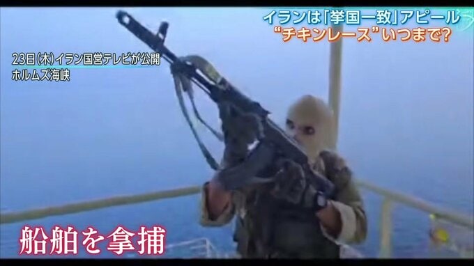 さらに、覆面姿で銃を背負い、はしごをのぼる隊員。4月23日、イランの革命防衛隊は、ホルムズ海峡で船舶を拿捕したとする映像を公開。
