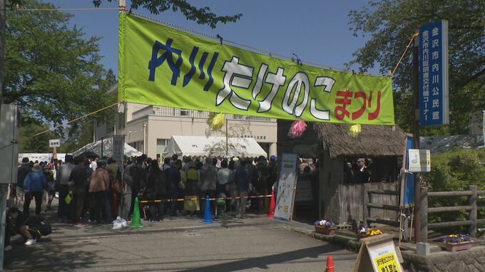 石川県内最大のタケノコの産地・金沢市の内川地区で26日、「たけのこまつり」が開かれ、旬の味覚を買い求める人たちの長い列ができました。