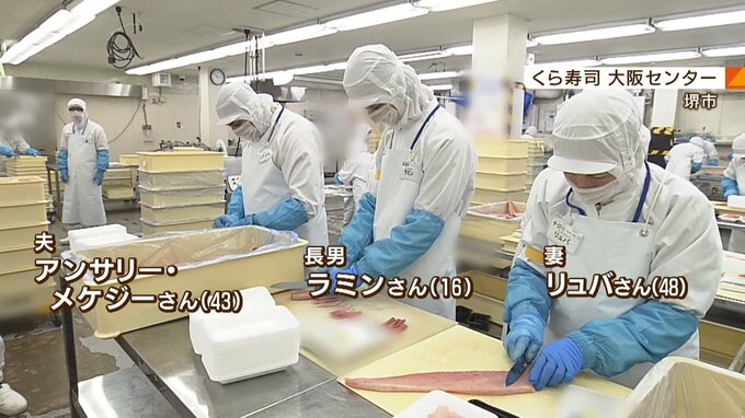 夫のメケジーさん(43)と妻のリュバさん(48)、長男のラミンさん(16)の3人は、去年10月から回転ずし大手の「くら寿司」の加工場で働いています。包丁を使いマグロを手際よくさばきます。