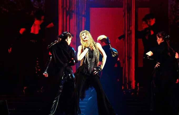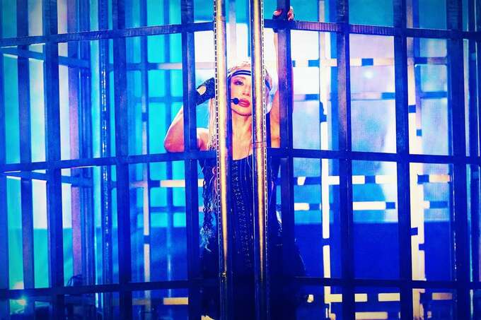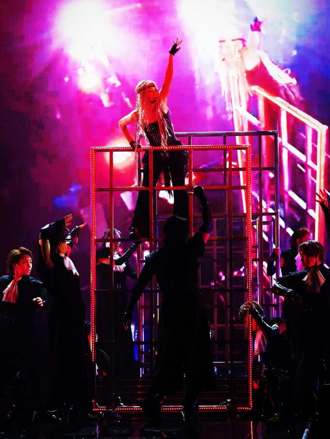 更に、ステージでは金属製のケージの上に立ち、ポーズを披露するショットも。黒衣装のダンサーたちが周囲を囲み、ピンク・紫・赤の鮮やかな照明がドラマチックな舞台空間を演出しています。