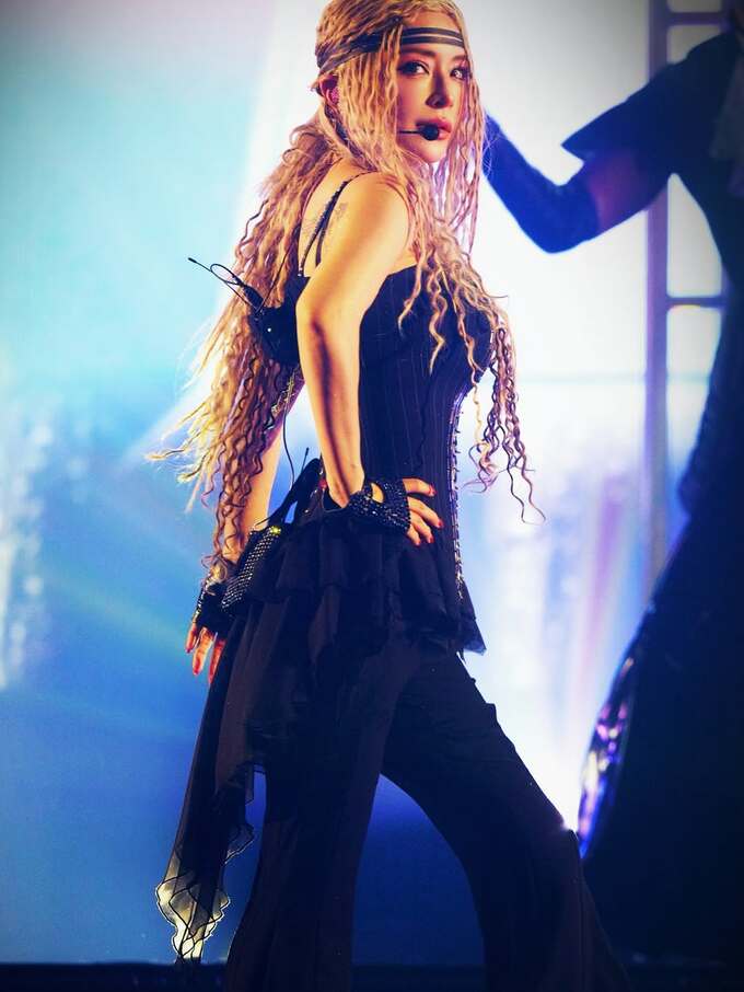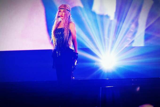 投稿された画像では、青紫の放射状の照明を背に静止し、ステージ前方を見つめる浜崎あゆみさんの姿が。