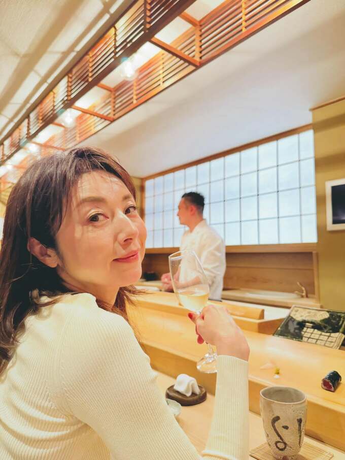 高岡さんは「今夜はお寿司とシャンパンで自分にご褒美」と綴ると、寿司屋さんのカウンター席で、シャンパン片手にほろ酔いのような姿を投稿。
