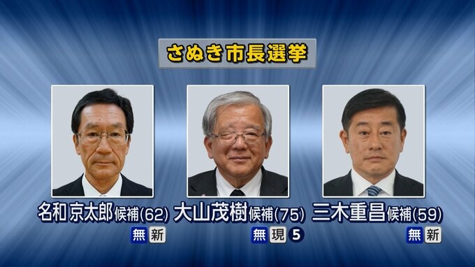 さぬき市長選挙に立候補しているのは、届け出順に、いずれも無所属で、新人で市遺族連合会副会長の名和京太郎候補、現職で6回目の当選を目指す大山茂樹候補、新人で元会社員の三木重昌候補の3人です。