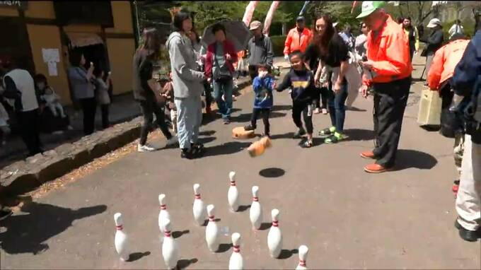 4月26日は子どもたちが丸太を転がしてピンを倒すボウリングのゲームやだるま落としなどに挑戦し、春の陽気の中、歓声をあげていました。