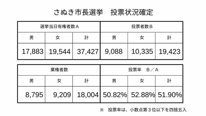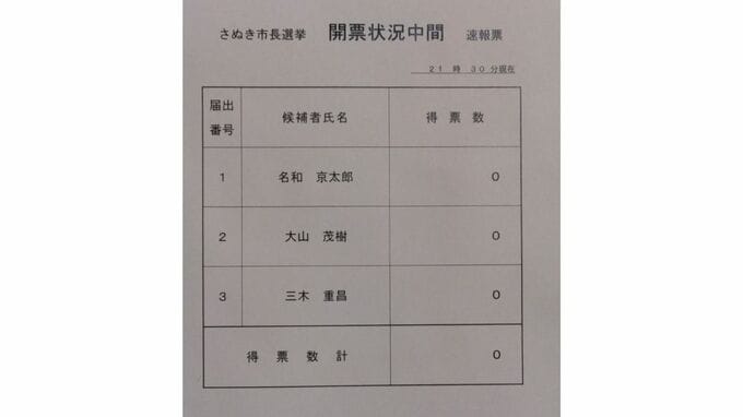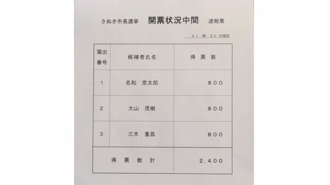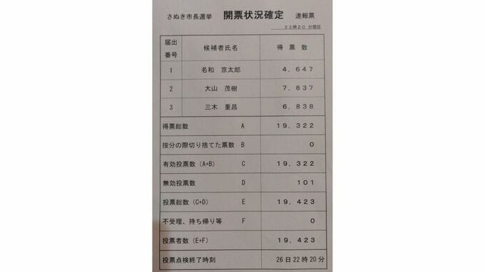 【開票速報】さぬき市長選挙 大山茂樹氏が6選 新人2人を退ける【26日午後10時20分確定】 RSK山陽放送 2026年4月26日(日) 21:08 国内 開票状況は? 投票はさぬき市内の23か所で行われ、投票率は51.90%と、8年前の前回を14.68ポイント上回っています。 確定票数(午後10時20分)は、【画像⑤】の通りです。 【画像②】 【画像③】 【画像④】 【画像⑤】