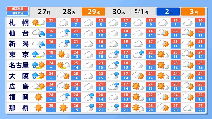 特に30日から5月1日ごろは、発達する低気圧が発達しながら本州の南岸を通過する見込みです。