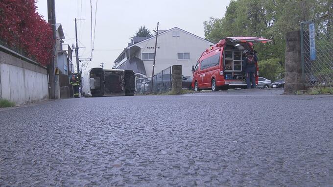 この事故で、横転した車を運転していた80代の男性が一時、車内に閉じ込められましたが、まもなく消防隊員に救助されました。