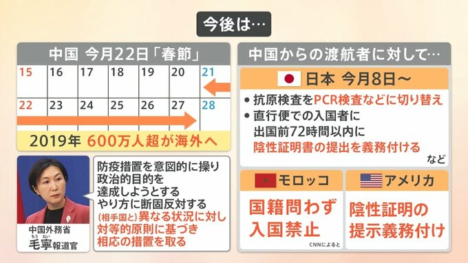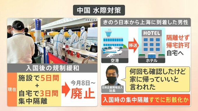 世界各国はコロナ前の状況に戻ってきている中で、中国の水際対策は、現在入国後の規制は緩和されています。隔離などについては、8日以降に廃止されるということです。