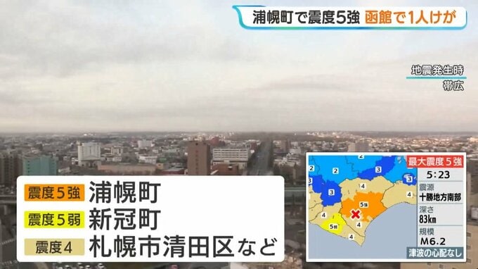 午前5時23分ごろの地震では、浦幌町で震度5強、新冠町で震度5弱、札幌市清田区などで震度4を観測しました。津波の心配はありません。