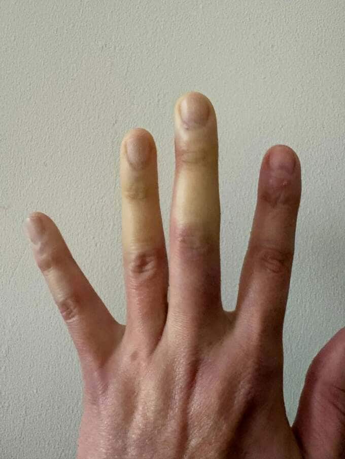 投稿には手の甲と指先を広げて掲げた写真も添えられており、指先が白く、あるいは黄色がかった色に変色している様子が確認できます。