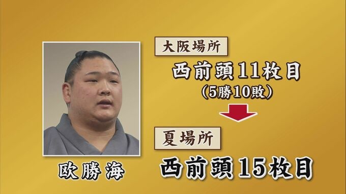 先場所5勝10敗と負け越した欧勝海は西の前頭十五枚目に番付を下げました。