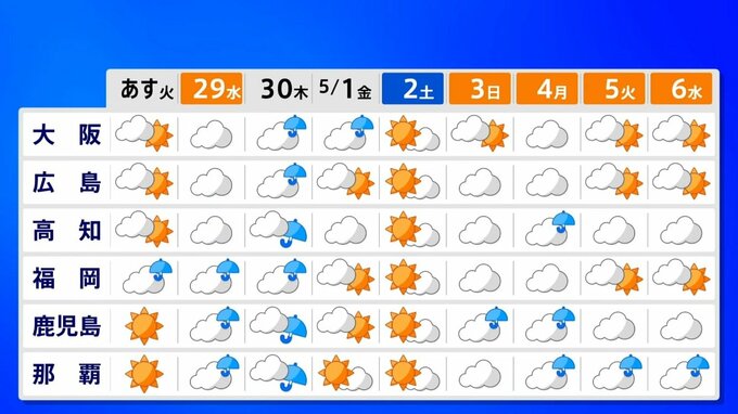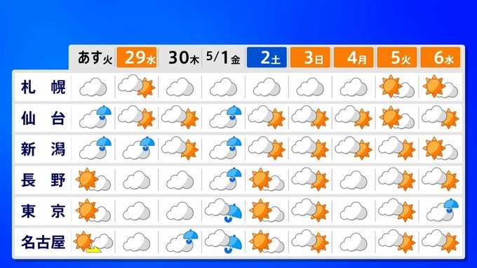 その後のゴールデンウイーク後半にかけては西日本で天気が周期的に変わりますが、北日本や東日本では比較的、晴れる日が多くなるでしょう。