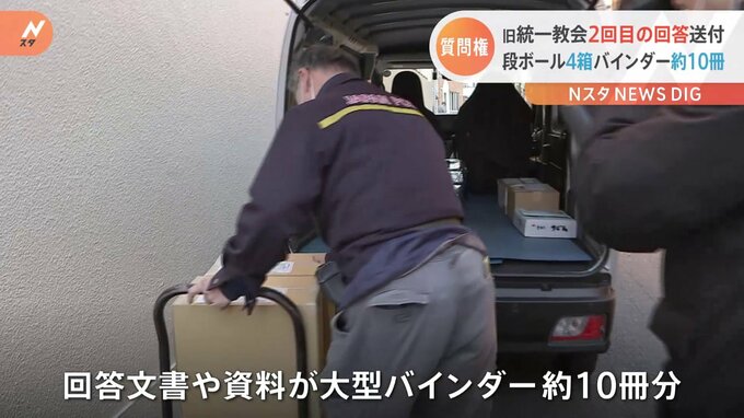 旧統一教会は明日期限を迎える2回目の質問権の回答について、きょう夕方に送付したと明らかにしました。記者「いま旧統一教会本部から2回目の質問権に対する回答が入ったとみられる段ボールが運び出されていきます…