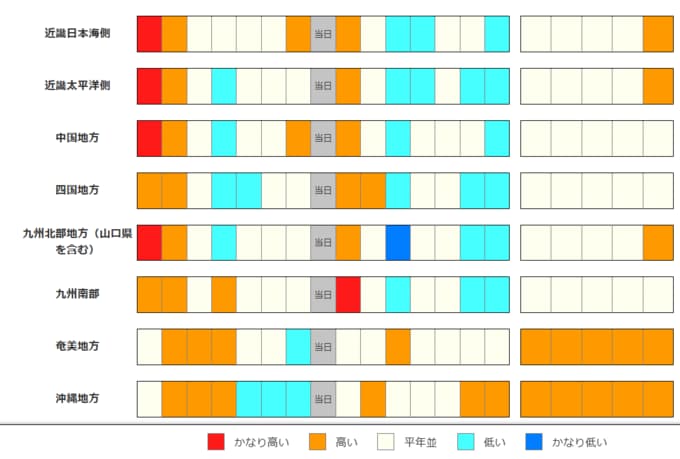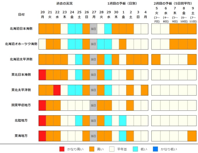 北海道地方の気温は、向こう2日間程度は低い日が多いですが、その後は平年並か高いでしょう。東北地方と東・西日本の気温は、向こう1週間程度は平年並か低い日が多いですが、その後は平年並の日が多いでしょう。沖縄・奄美の向こう2週間の気温は、平年並か高いでしょう。