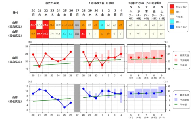 ・最近1週間の実況と今後2週間先までの気温の推移を表示しています。