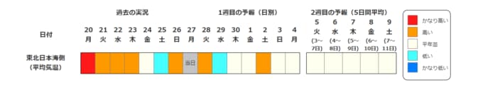 ・2週目の予報は中心の日に前後2日間を加えた5日間の平均(最高気温の5日間平均、最低気温の5日間平均、平均気温の5日間平均)です。平均期間を中心の日の下に表示しています。2週目のかなり高い(かなり低い)は、かなり高い(かなり低い)気温となる確率が30%以上のときに表示します。
