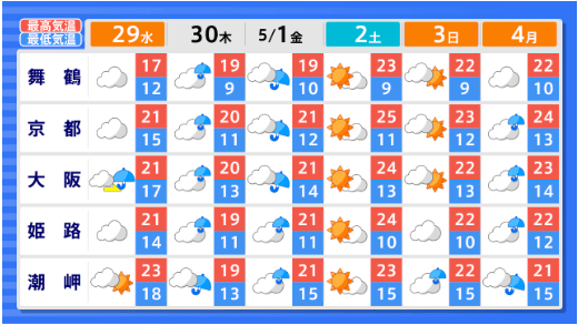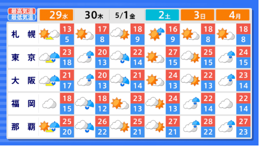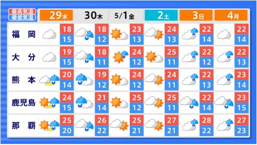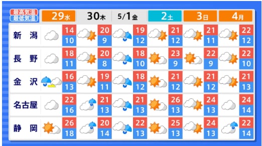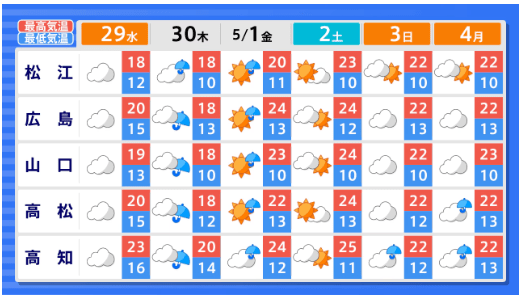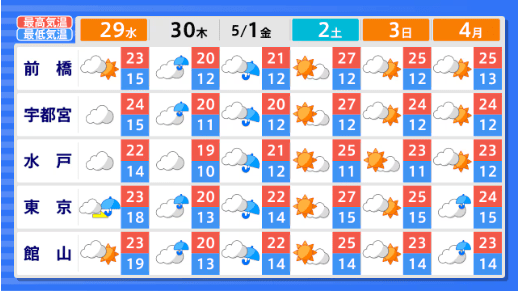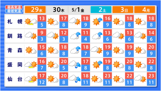【2週間気温予報】東北地方と東・西日本の気温は、向こう1週間程度は平年並か低い日が多い予報 その後は平年並の日が多い予報 今後の全国の天気を画像で 気象庁 テレビユー山形 2026年4月27日(月) 15:03 国内 ■全国の天気を地方ごとに(画像) 画像はTBS NEWS DIG Powered by JNNより 画像ありの記事を最初から https://newsdig.tbs.co.jp/articles/-/2627340?display=1