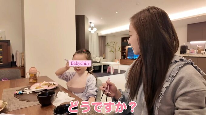 夕食の支度には娘のベビちんもお手伝いとして参加。アボカドの混ぜ混ぜやお肉へのフォーク刺しに挑戦しました。板野さんに何がおいしいか聞かれると、ベビちんが指さして笑顔を見せるなど、親子で和やかに夕食を楽しむ様子が収められていました。