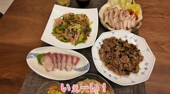 その後、板野さんは娘のベビちんとともに電動自転車でスーパーへ買い出しへ。帰宅後は疲れてうとうとしながらも洗濯物をたたみ、夜ご飯の支度に取りかかります。この日のメニューはチャプチェ、マーボーナス風のナスとオクラのネバネバ炒め、エリンギとえのきのバター炒め、アボカドサーモンなど、バラエティ豊かな品揃えでした。
