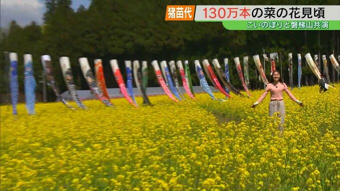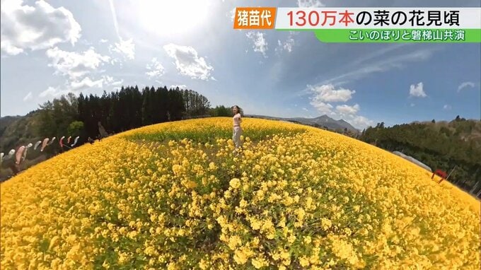 1万3000平方メートルの広大な敷地におよそ130万本が咲き誇っています。この日は、晴れて磐梯山もくっきり。また、心地よい風の中こいのぼりが菜の花の海を優雅に泳ぎます。午前中から多くの人が訪れ、美しい景色を写真に収めていました。