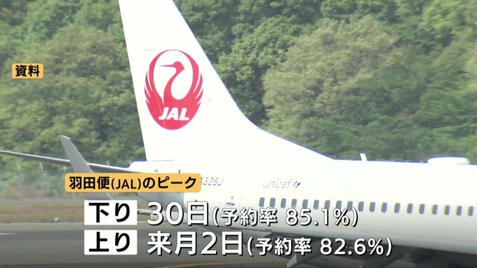 JAL=日本航空によりますと、広島ー羽田便の予約数は、1万5129人で、去年に比べて3.8ポイント下回りました。羽田便のピークは、下りが30日、上りは来月2日となっています。一方、札幌便の予約数は2230人で、前年比で1.1ポイント増加しました。