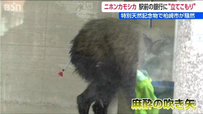 ニホンカモシカは国の特別天然記念物に指定されていて、柏崎市は捕獲に向けて国から許可が出るのを待っていましたが、午後3時ごろに吹き矢が放たれ、麻酔が効いておとなしくなったところを捕獲されました。
