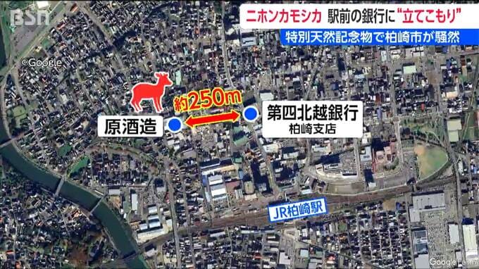 午前10時半ごろには、銀行にいたのと同じ個体とみられるニホンカモシカが、250mほど離れた酒造会社でも目撃されていました。