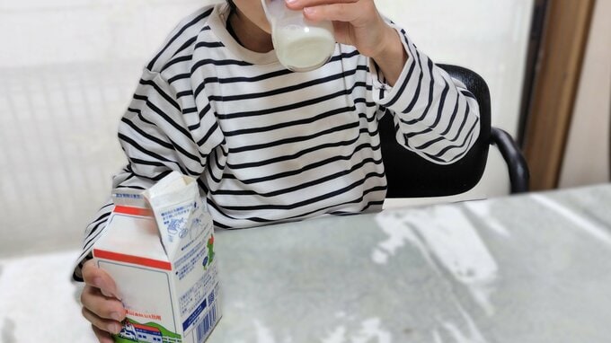 健介くん、家で牛乳はコップに入れて飲んでいます。パックから直接飲むとは想像したことも、やろうとしたこともなかったのです。