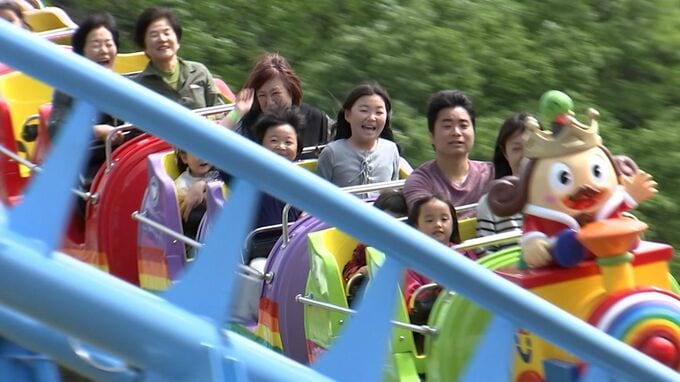 招待された家族連れが見守る中、華やかにセレモニーが行われました。注目は、ひと足早く公開された新アトラクション『レインボーコースター』です。来場者らは、さっそく全長211メートルを駆け抜けるジェットコースターを楽しんでいました。