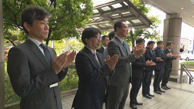 津幡町の吉田克也新町長は午前8時ごろ、町役場に初登庁し、集まったおよそ100人の職員に出迎えられました。