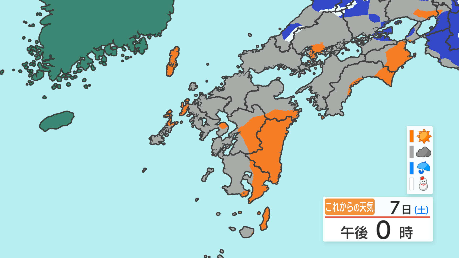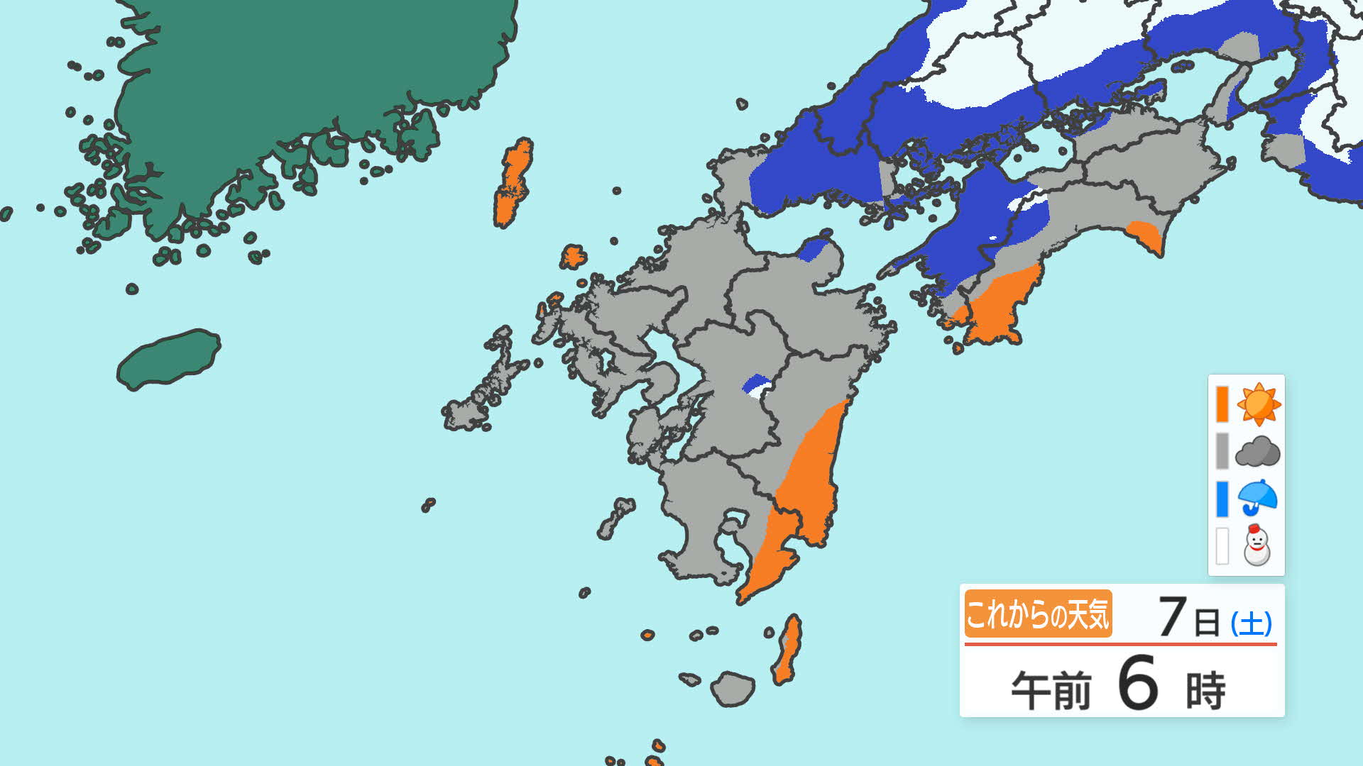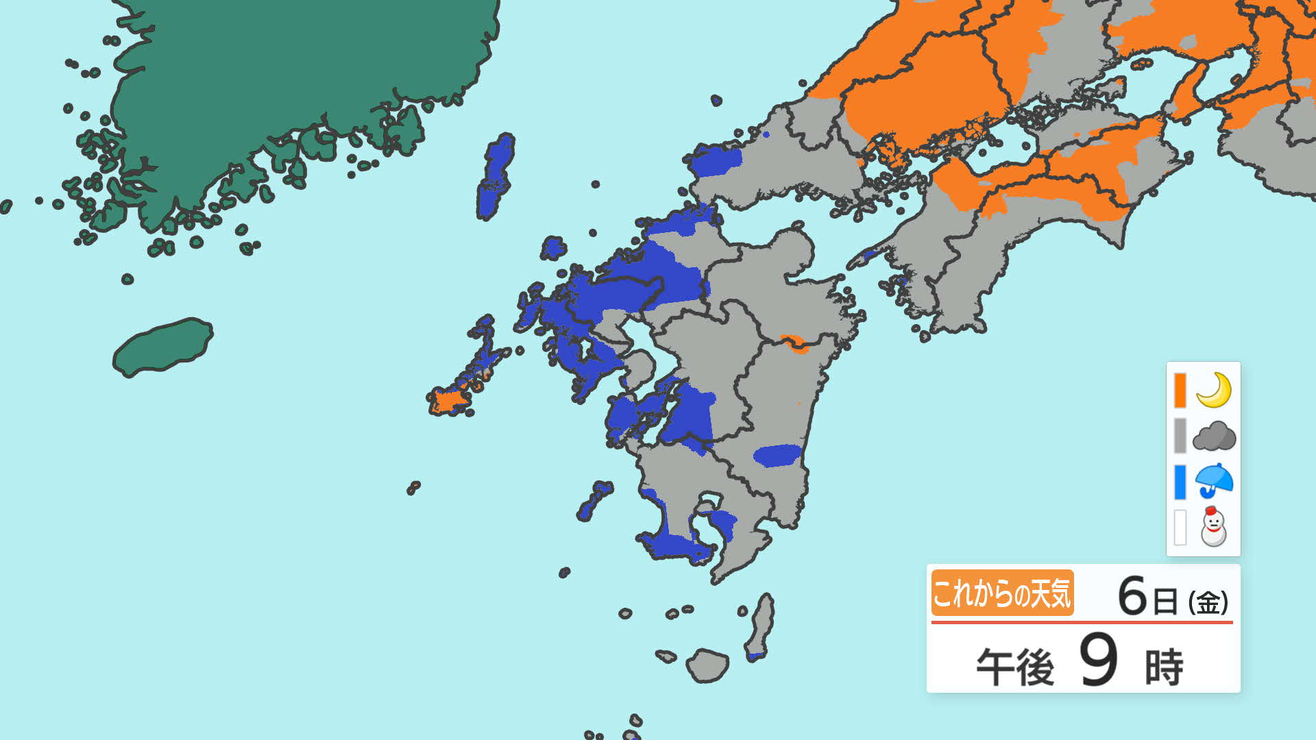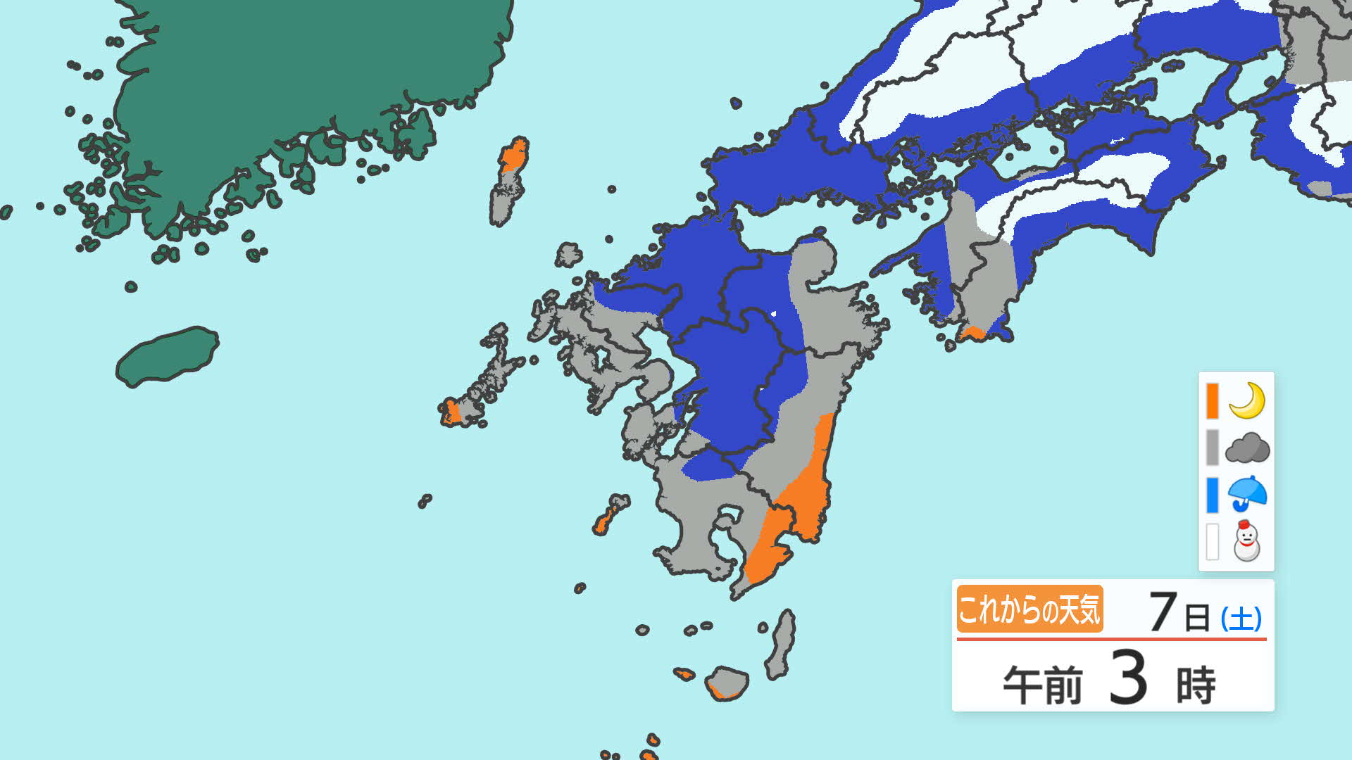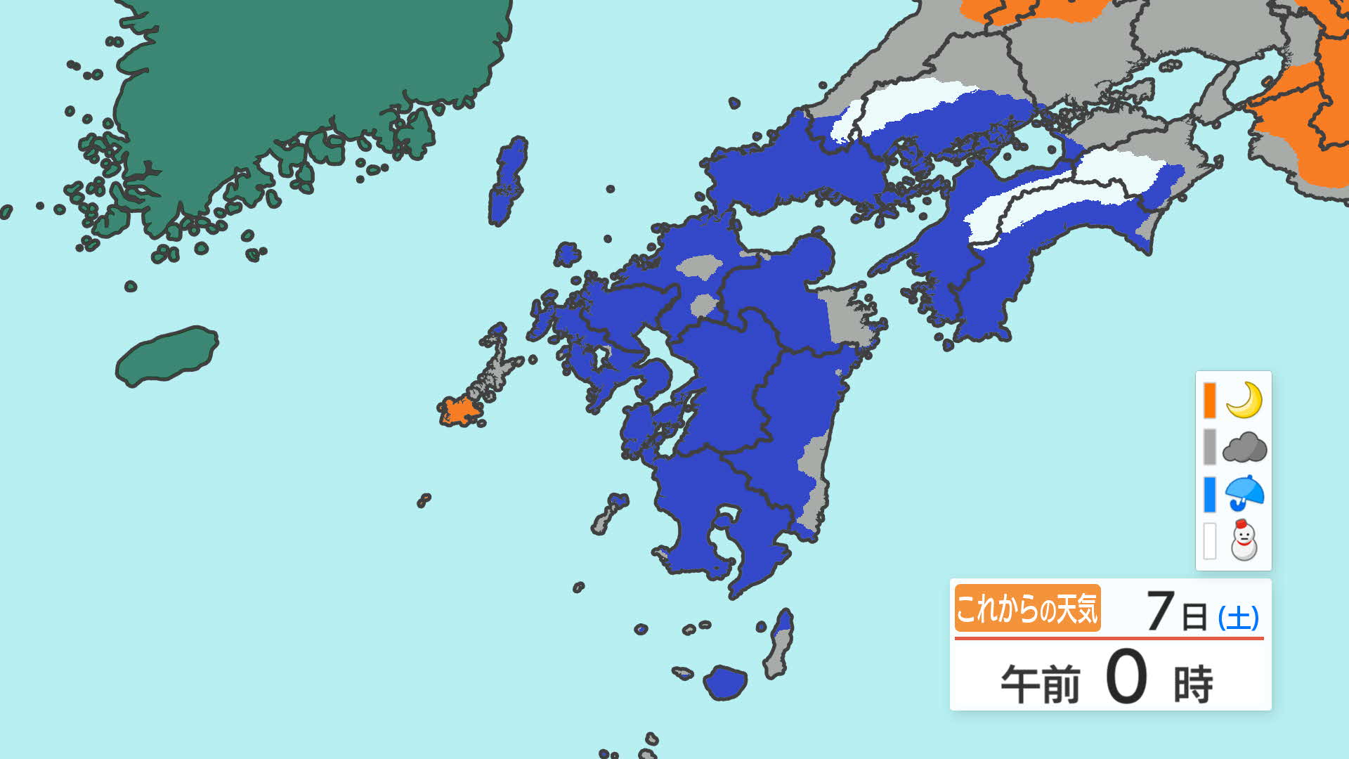 7日午前0時ごろには九州のほとんどが雨のエリアになる予想です。雨は未明から明け方まで続く予想です。