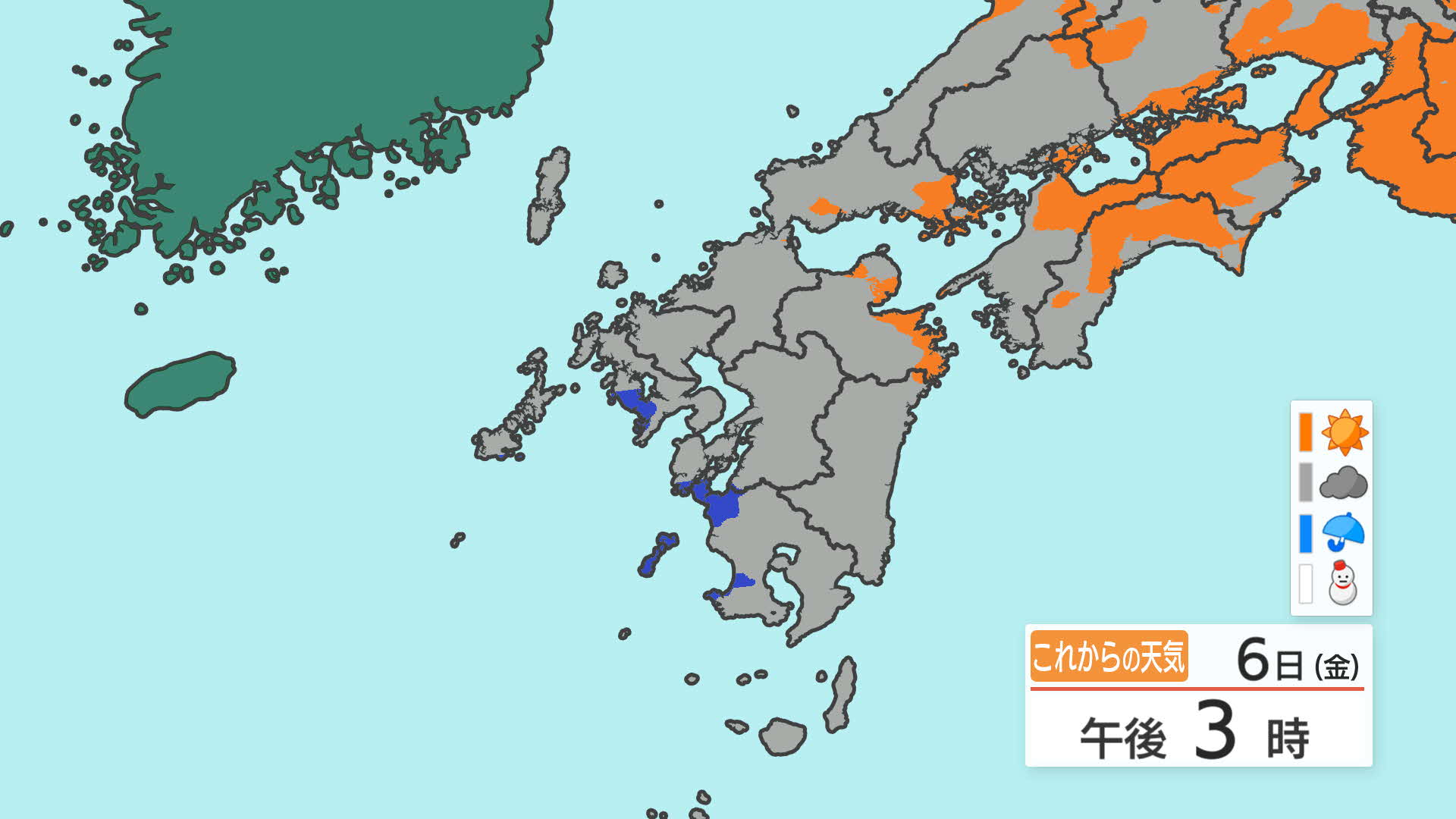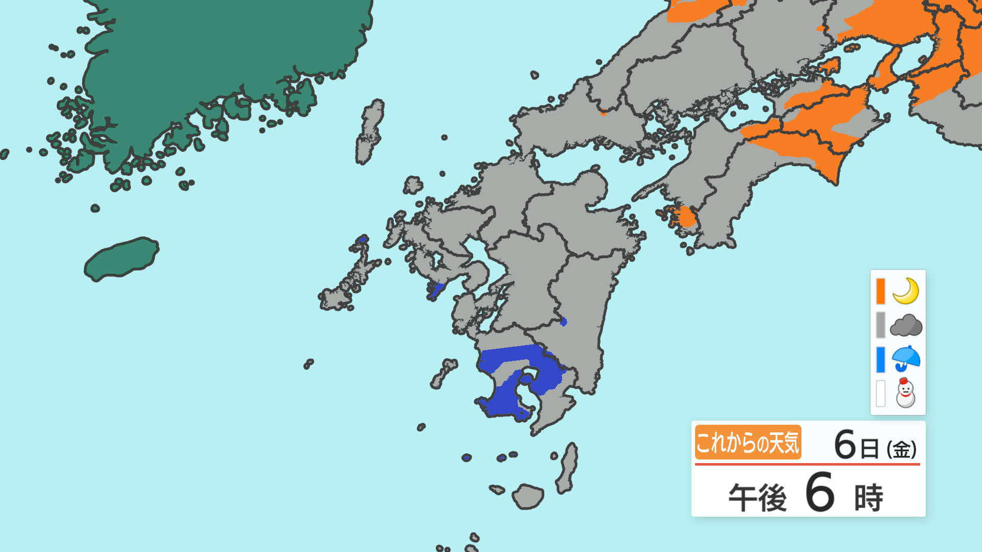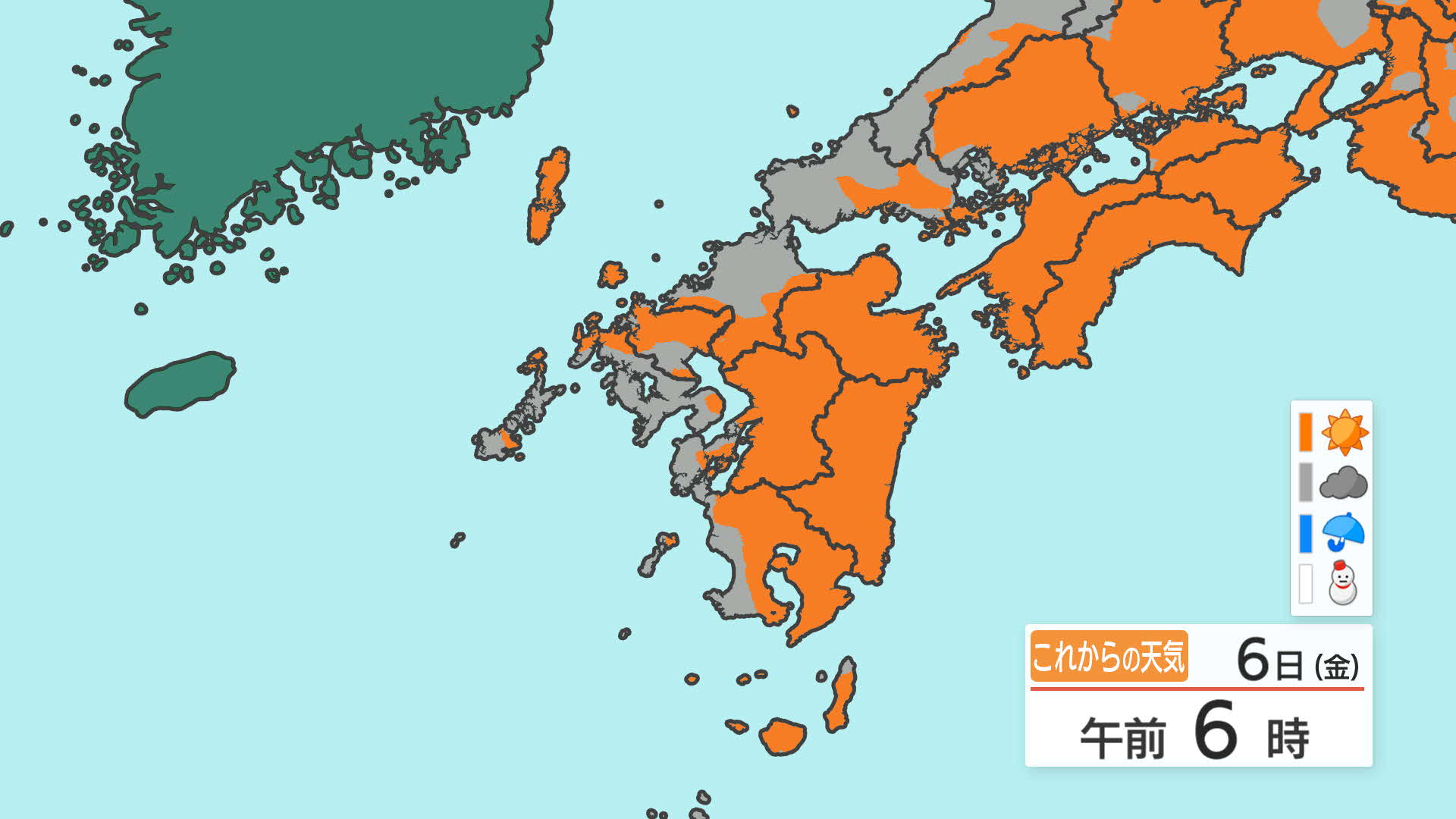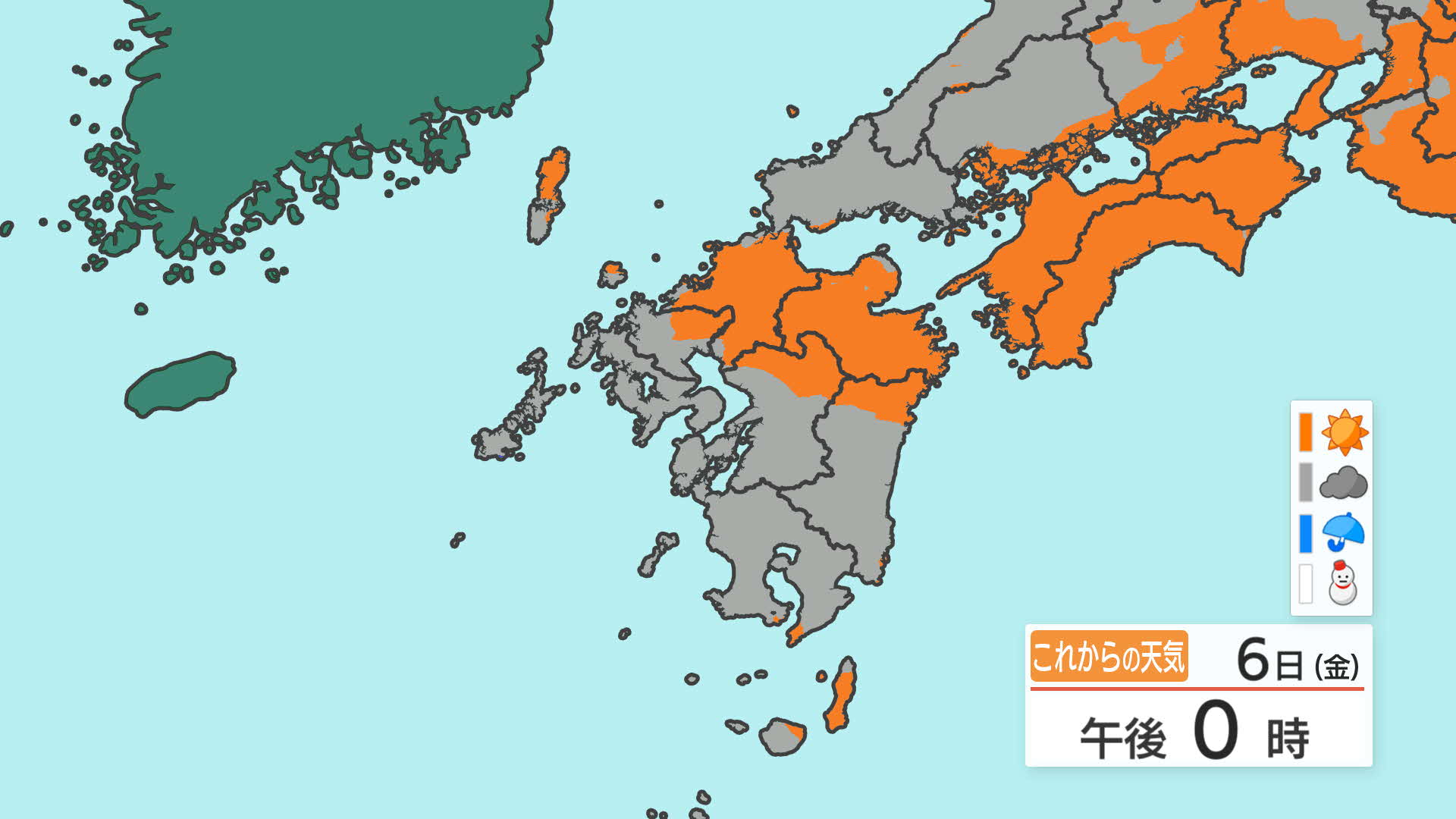 6日午前中は晴れや曇りのエリアが多いですが、午後から夜にかけて九州南部から雨のエリアが広がる予想です。