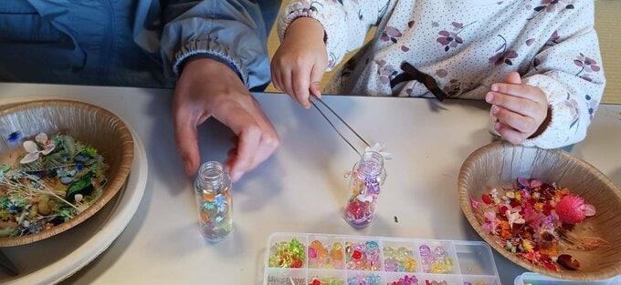 カラフルなお花や、キラキラしたビーズから思い思いにお好みのものを選ぶ時間も含め、とても素敵な時間を過ごすことができました。
