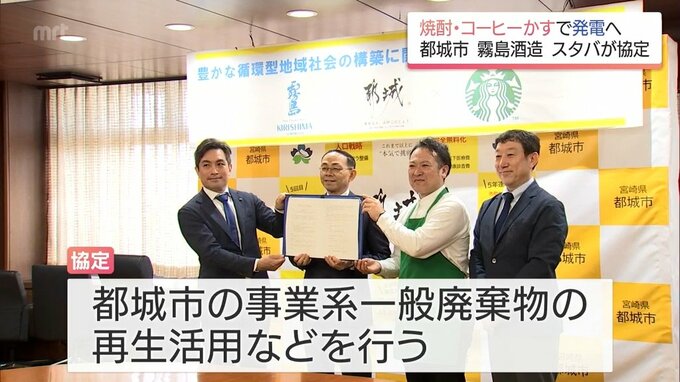 廃棄物の削減や地域資源の循環利用の促進につなげようと、宮崎県都城市と霧島酒造、それに、スターバックス コーヒー ジャパンが連携協定を結びました。27日の締結式では、都城市と霧島酒造、スターバックス コー…