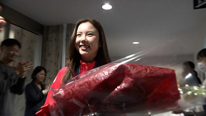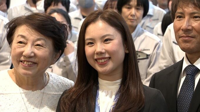 また吉田選手はこのあと、ジュニア時代の2019年から吉田選手を応援してきたフジワラテクノアートの本社を訪れ、拍手で出迎えた約120人の社員に銀メダル獲得を報告しました。