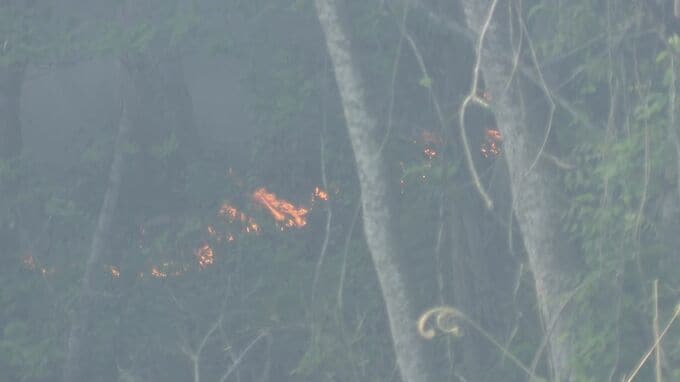 小枝佳祐記者「山林火災の現場です。あたり一面が焼け野原となっていて、向こうにはまだ炎が見えます」