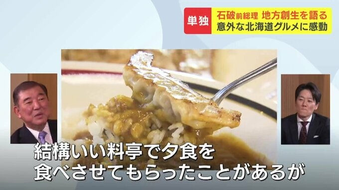 石破茂前総理大臣:そう。何だこの不思議な食べ物は?って。食べたら、これがおいしかったのよね。結構いい料亭で、夕食を食べさせていただいたことがあるんだけど、なにが食べたいですかと聞かれて、「ぎょうざカレー」と言ったんです。ひんしゅくを買いました。