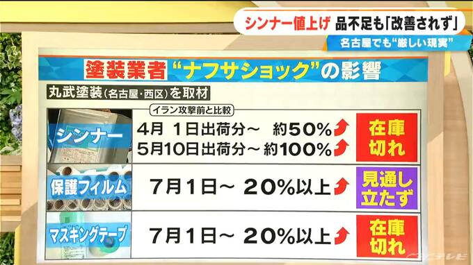 27日に取材した名古屋・西区にある「丸武塗装」では、取り扱っているシンナーはアメリカのイラン攻撃前と比べて、4月1日出荷分から仕入れ値が約50%アップ。5月10日出荷分からは約100%アップ。イラン攻撃前と比べほぼ2倍にまで仕入れ値が上昇しています。