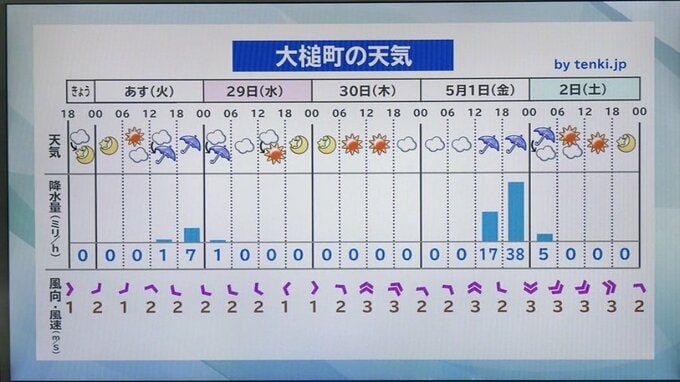 5月1日(金)は南から北よりの風に変わり、昼頃から雨が強まる恐れ。