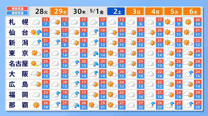 気象庁によりますと、30日から5月1日ごろにかけて、前線を伴った低気圧が発達しながら本州南岸付近を東へ進む見込みです。