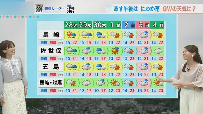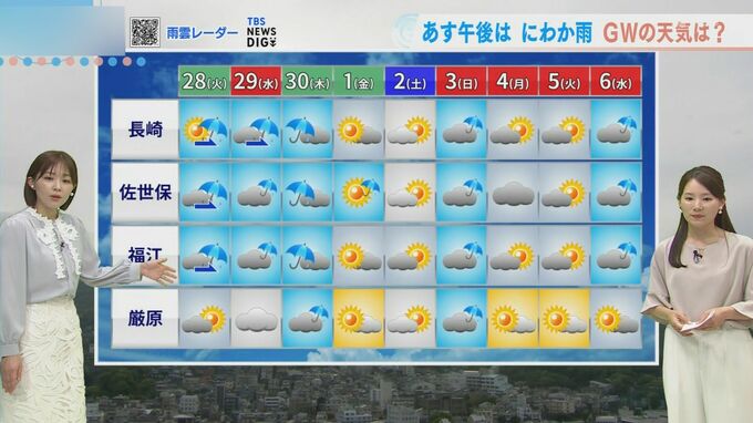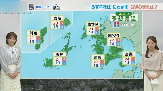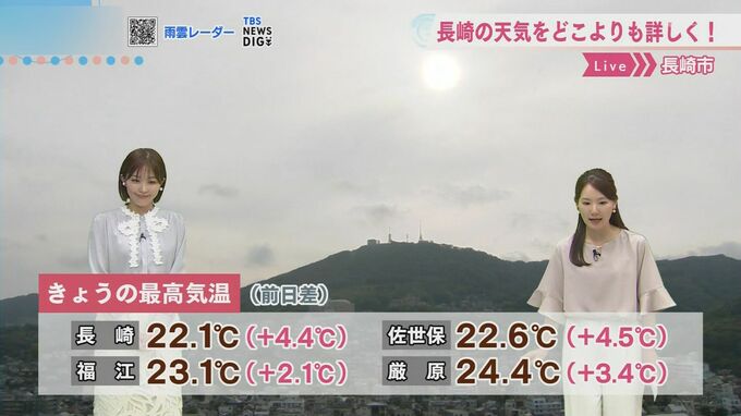 最高気温は長崎22.1℃、福江23.1℃、佐世保22.6℃、厳原24.4℃となりました。