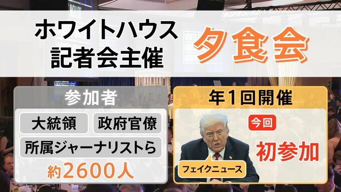 トランプ大統領は、既存メディアを“フェイクニュース”などと敵視していますので、第1次政権も含めて今回が初参加です。そういう意味でも注目度が高い夕食会でした。